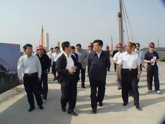2008年5月5日下午,許立全市長(zhǎng)視察建設(shè)中的奧體中心工程。董事長(zhǎng)徐鵬強(qiáng)(上圖左一)陪同視察。 |