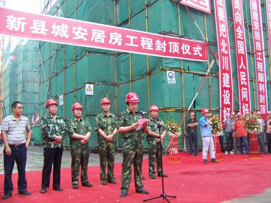 9月25日上午11時20分,山東省援建新北川安居房工程舉行隆重的封頂儀式,儀式地點(diǎn)就設(shè)在集團(tuán)公司承建的工程施工現(xiàn)場。中央電視臺新聞頻道在中午11時至12時的新聞直播段進(jìn)行了現(xiàn)場插播報(bào)道,“昌大建設(shè)”字號和援川人員多次在畫面中出現(xiàn)。集團(tuán)公司總經(jīng)理朱九洲參加了今天的封頂儀式并講話。今天封頂儀式現(xiàn)場下著大雨,援川人員在雨中舉行了這一慶奠。 根據(jù)指揮部的消息,第八分公司承擔(dān)的六棟安居房已于昨天(24日)全部封頂。