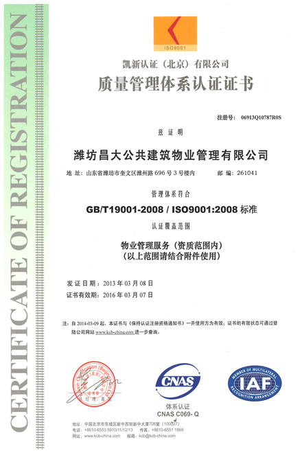 近日,集團公管公司(濰坊昌大公共建筑物業(yè)管理有限公司)通過ISO9001質(zhì)量管理認證。ISO9001質(zhì)量管理認證的取得和實施,對于公管公司提高物業(yè)管理水平,擴大企業(yè)知名度,增強企業(yè)競爭力都有約束和推動作用。
