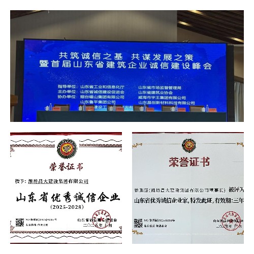 近日,由山東省誠信建設(shè)促進會組織的“共筑誠信之基,共謀發(fā)展之策暨首屆山東省建筑企業(yè)誠信建設(shè)峰會”在山東煙臺隆重召開。會上,山東省誠信建設(shè)促進會公布了首屆建筑業(yè)山東省優(yōu)秀誠信企業(yè)及優(yōu)秀誠信企業(yè)家”名單,集團公司榮獲山東省優(yōu)秀誠信企業(yè)稱號,董事長徐鵬強被評為山東省優(yōu)秀誠信企業(yè)家。